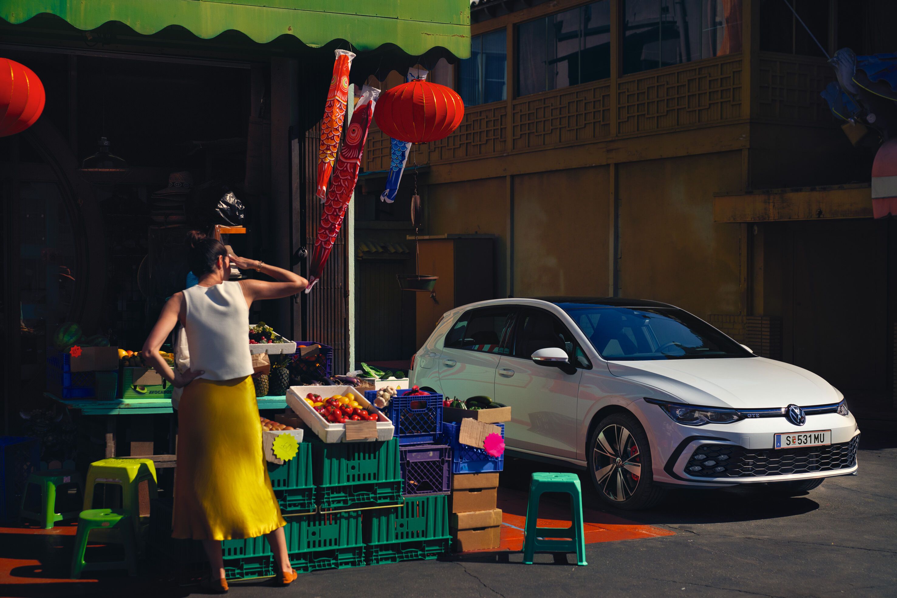 A Golf GTE a külső hangulatvilágításával üdvözli Önt: használja a távirányítású kulcsot vagy az opcionális, Safe funkcióval rendelkező Keyless Access indítórendszert, és ahogy közeledik a járműhöz, a fényszóró és a hátsó lámpák felvillannak. Az ajtókilincs mélyedései és a hűtőrács kék sávja is világít, Golf GTE modellje a külső tükörből vetíti ki a fényt a talajra.